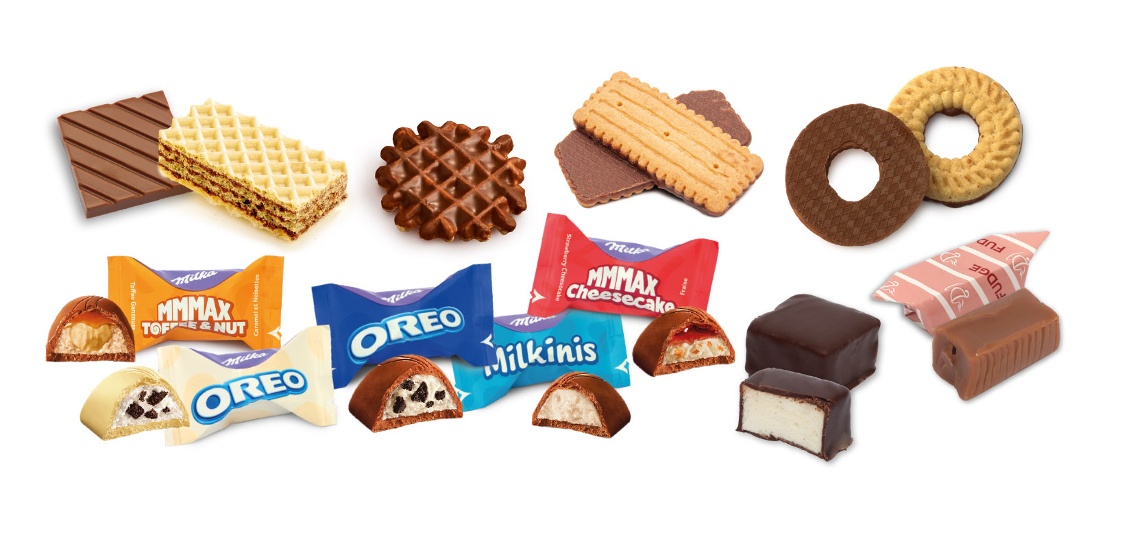 Ingredients: Sugar, wheat flour, vegetable oils and fats (palm kernel, palm, water, palm fat, rapeseed oil, emulsifier: E471, salt, rapeseed, acidity regulator: citric acid, preservative: potassium sorbate, flavoring, color: bixin), glucose, milk chocolate (sugar, cocoa butter, whole milk powder, cocoa mass, milk fat, emulsifier: soy lecithin), whole milk powder, dark chocolate (cocoa mass, sugar, cocoa powder, emulsifier (soy lecithin)), milk chocolate (20%) (vegetable fats: palm; whole milk powder, low-fat cocoa powder, emulsifier: soy lecithin E322, sorbitan tristearate E492; natural flavoring: vanilla), cocoa butter, margarine (vegetable oils and fats (palm, rapeseed), water, emulsifier: soy lecithin) E322, mono- and diglycerides of fatty acids (E471), salt, acidity regulator: E330, natural flavorings, colorings: E160a), lactose, hydrogenated and partially hydrogenated oil and fat (coconut), invert sugar, varkens gelatin, low-fat cocoa powder, eggs, skimmed milk powder, natural flavoring, whey powder (milk), preservative (E202), cocoa mass, raising agents (E500, E450, E503, E501), milk fat, salt, cocoa powder, wheat starch, emulsifiers (soy lecithin, mono- and diglycerides of fatty acids), soy flour, hazelnuts, glucose-fructose syrup, cheese powder (from milk), strawberry puree, hazelnut paste, corn, flavorings, humectant (glycerol), lemon juice concentrate, flavoring (vanillin). Blackcurrant juice concentrate, acidity regulator (E524), flavoring, vanillin. May contain traces of peanuts.