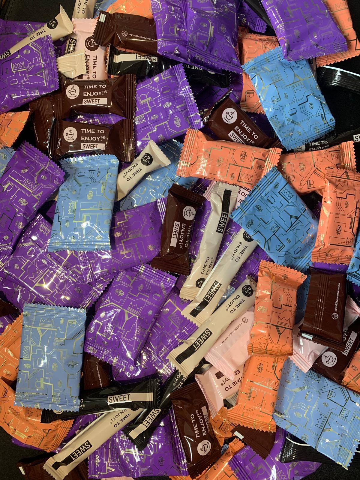 Ingrediënten assortiment: tarwebloem, suiker, plantaardige oliën en vetten (palm, kopra, kokos, raapzaadolie, koolzaad), donkere chocolade (suiker, cacaomassa, cacaoboter, gedroogd melkvet, emulgator (sojalecithine), natuurlijk vanille aroma), melkchocolade (20%) (plantaardige vetten: palm; vol melkpoeder, mager cacaopoeder, emulgator: sojalecithine E322, sorbitane tristearaat E492; natuurlijk aroma: vanille), cacaofantasie (suiker, ongeharde plantaardige vetten (kokos, palmpit, palm, zonnebloem, shea, koolzaad) in wisselende verhoudingen, mager cacaopoeder, stabilisator E492, emulgator E322 (bevat soja), aroma: vanilline), speciale coating met plantaardig vet (52%) (suiker, plantaardige vetten (palmpit, palm), ontvette cacaopoeder (22%), plantaardige oliën (raapzaad, palm), emulgatoren (zonnebloemlecithine, sorbitaantristearaat), aroma), suikergoedcoating (52%) (suiker, plantaardige vetten (palmpit, palm), mager melkpoeder, plantaardige oliën (raapzaad, palm), emulgator (sojalecithine), aroma), margarine (plantaardige oliën en vetten (palm, raapzaad), water, emulgatoren: sojalecithine E322, mono- en diglyceriden van vetzuren E471), zout, zuurteregelaar: E330, natuurlijke aroma's, kleurstof: E160a), eieren, palmolie, weipoeder (melk), geharde en gedeeltelijk geharde plantaardige olie en vet (kokos), raapzaadolie, mager cacaopoeder, mager melkpoeder, mais zetmeel, kokosnoot, cacaopoeder, sojabloem, zout, emulgatoren (sojalecithine, zonnebloemlecithine), hazelnoten, tarwezetmeel, kleurstoffen (E150a, E160b(ii)), palmvet, glucose, rijsmiddelen (E500, E170, E450), invertsuiker, boteraroma, vanilline, aroma, aroma's (aroma, natuurlijk aroma, vanille-extract), natuurlijk aroma, voedingszuur (E330). Kan sporen bevatten van pinda's.